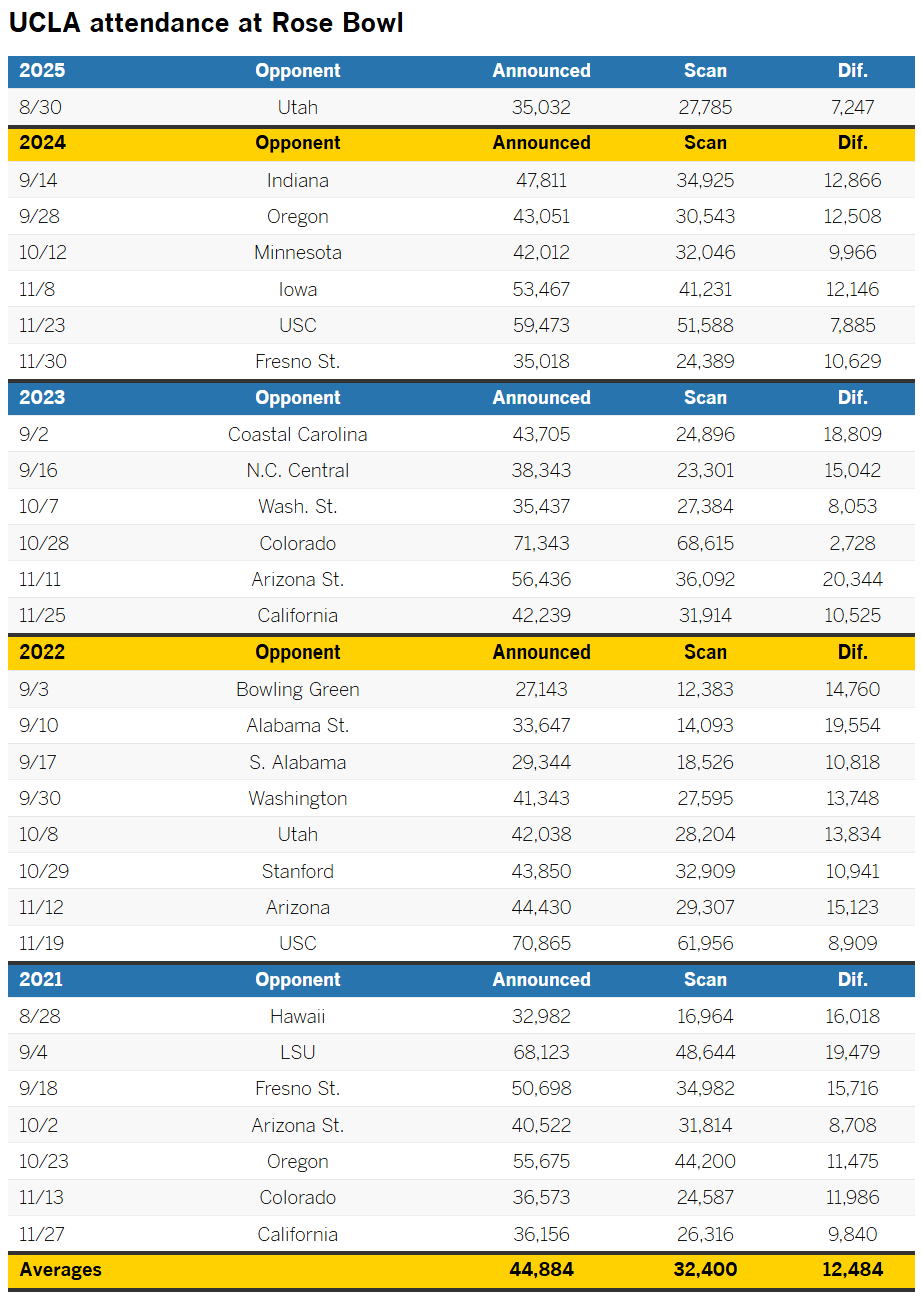 He mentions how “UCLA officials have been known to embellish attendance figures, sometimes rounding far enough past the next thousand not to strain credulity, according to two people familiar with operations who spoke on condition of anonymity because of the sensitivity of the matter.”