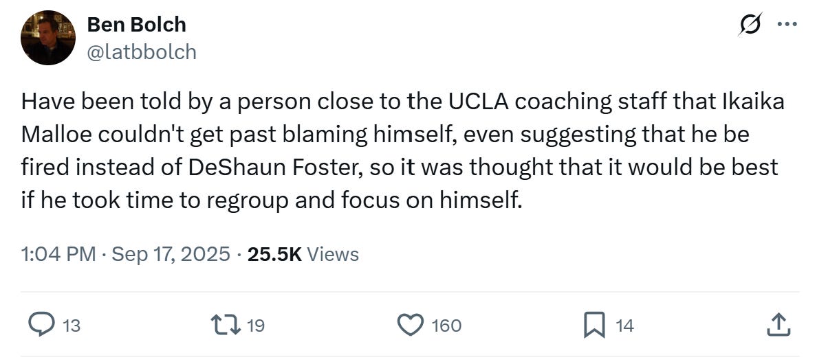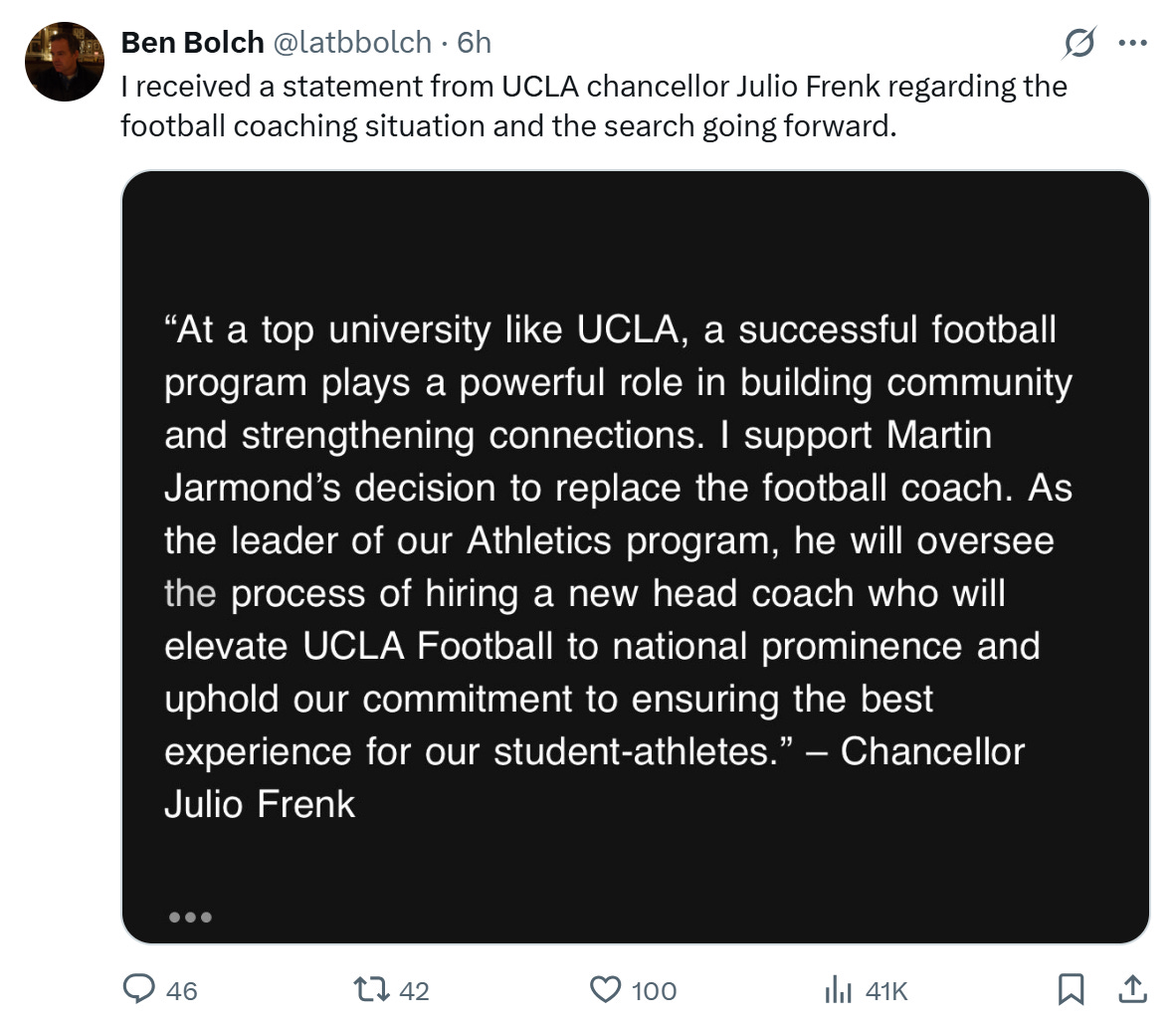 Finally, today, we have one more piece of news, courtesy of Ben Bolch of the LA Times. A few hours before he broke the Malloe news, Bolch post a statement from UCLA Chancellor Julio Frenk to X.com.