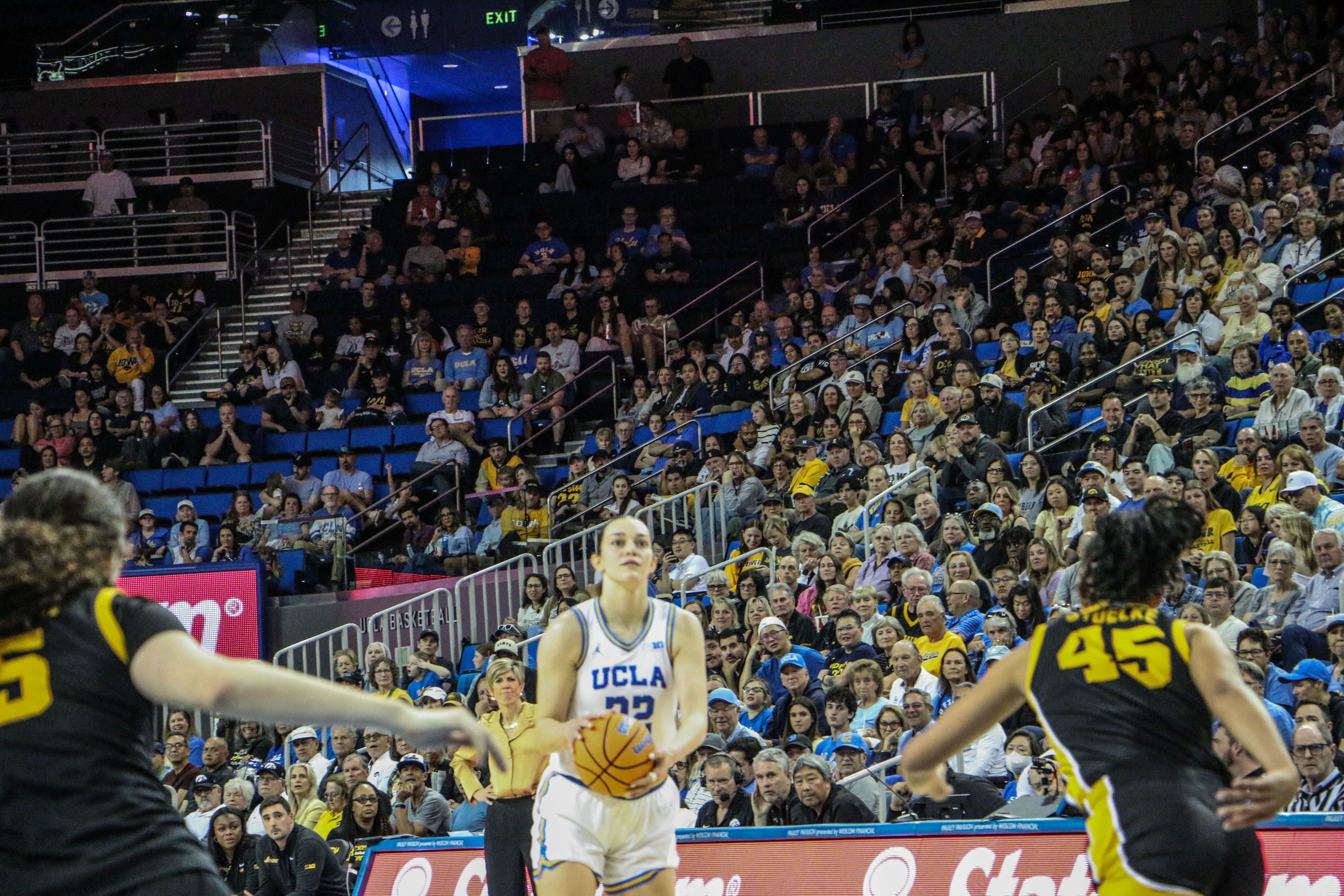 Charlisse Leger-Walker scored the first basket of the game to put the Bruins up, 2-0, but Chit-Chat Wright responded with a three to give Iowa the lead. On Iowa’s next possession, Hannah Stuelke increased Iowa’s lead to three.