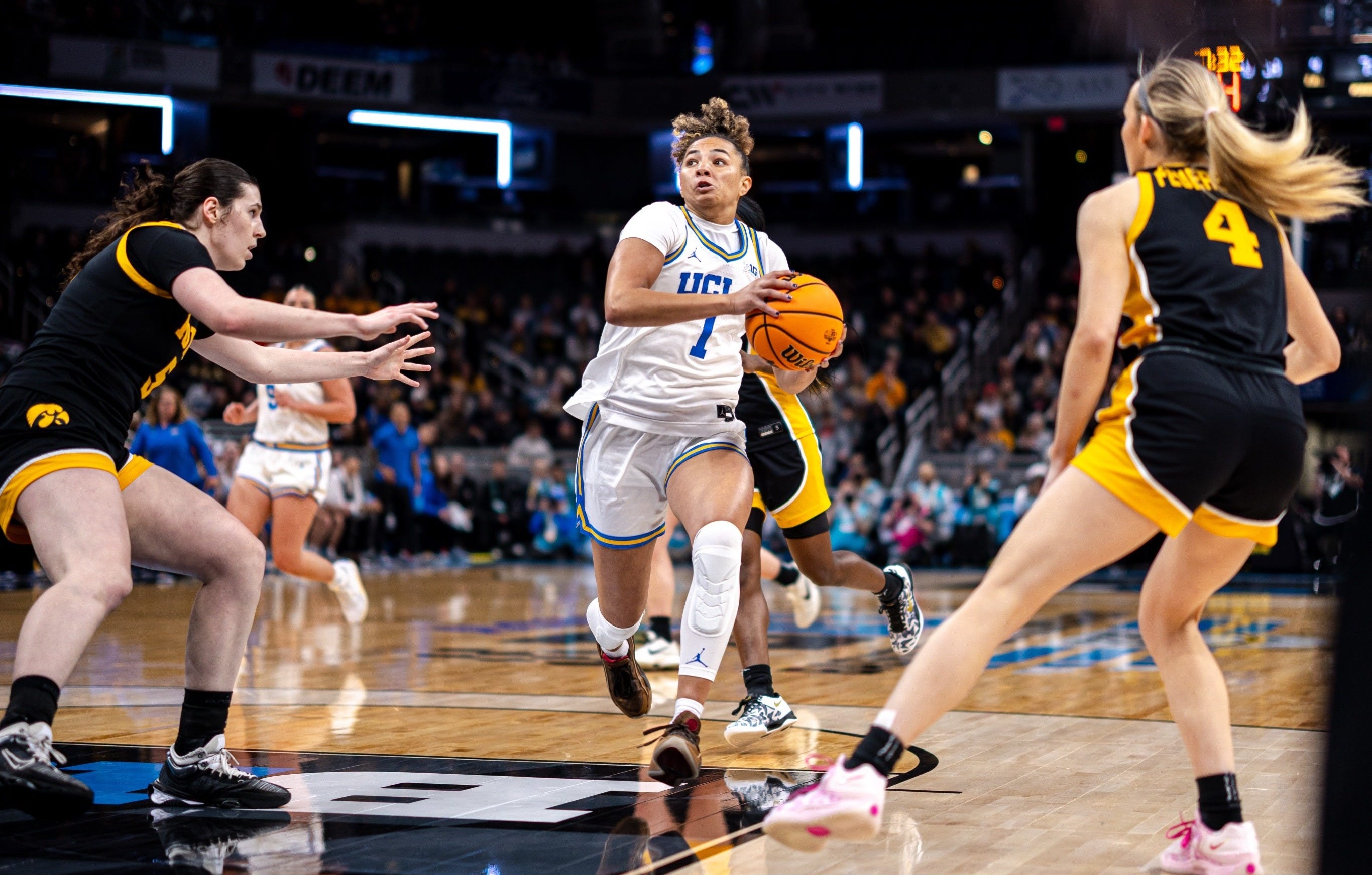 The rest of the Bruins were no slouches either. Gianna Kneepkens led the team with 19 points on 6-11 shooting. Iowa seemingly lost Kneepkens on every other possession, as the senior guard got numerous open looks that you would not expect to get in a conference championship game. Gabriela Jaquez chipped in 12 points on 5-6 shooting while adding three steals of her own. Charlisse Leger-Walker was more engaged offensively in this game, getting 11 points on 4-8 shooting (3-6 from deep), while similarly nabbing three steals. Leger-Walker, in particular, had a knack for just knocking the ball loose against Iowa, and if StatBroadcast kept track of deflections, I have a feeling she would have led the team.
