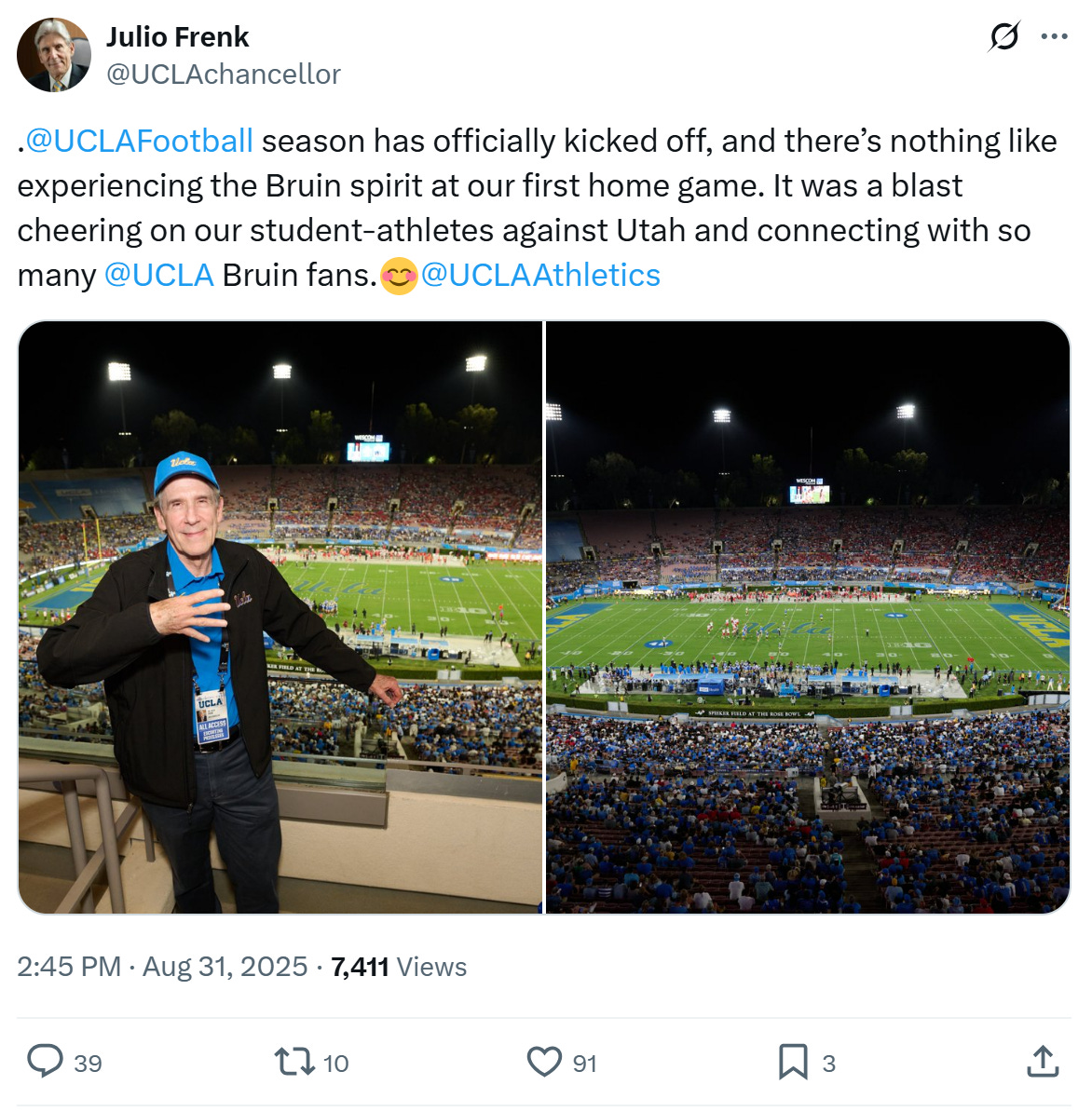 Now, I didn’t see Chancellor Frenk at last night’s game. So, I don’t know if he was in the building or not, but it was the first UCLA football game since he became Chancellor in January. I sure hope he was there to witness the embarrassment that was last night’s game.