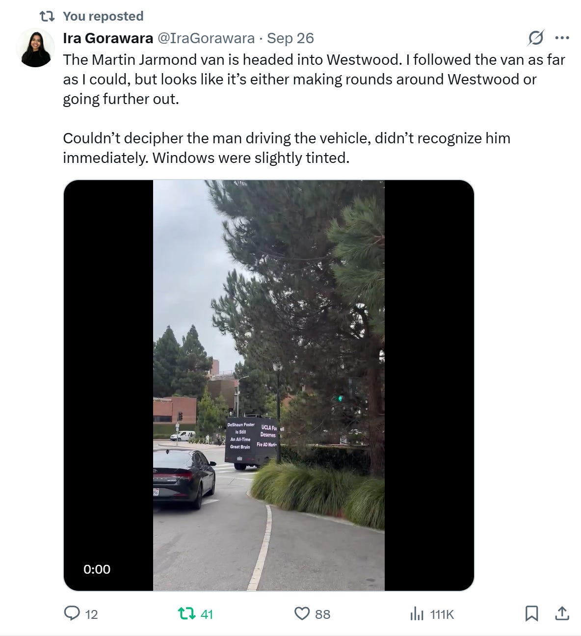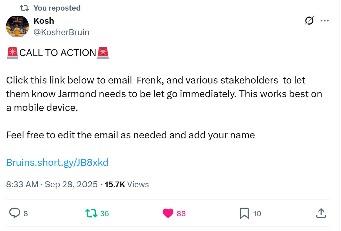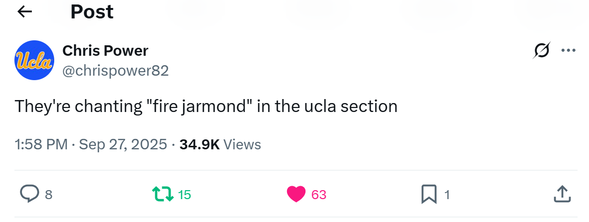 For those of you who may not be on X.com (fka Twitter), there were reports yesterday that there were chants of “Fire Jarmond!” in the UCLA section at the Northwestern game yesterday.