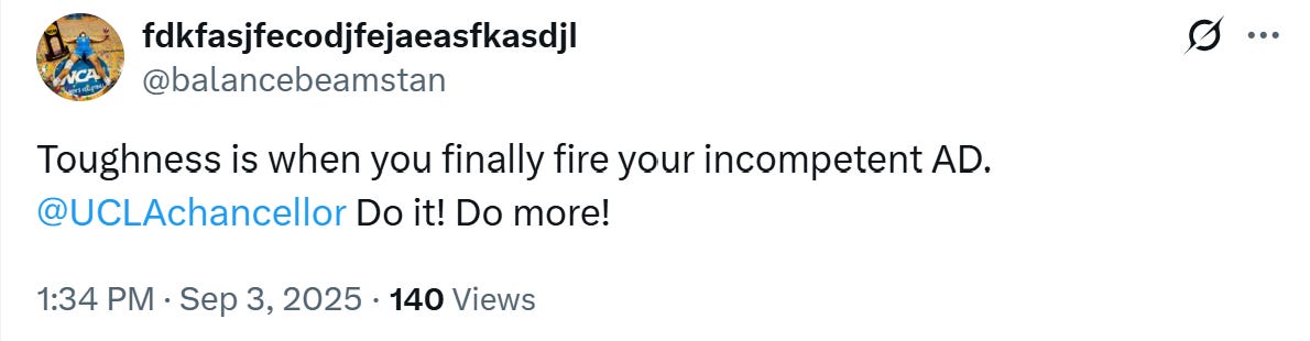 As if that reaction wasn’t bad enough, the team X account posted the same thing, albeit with less photos. The reaction there was equally brutal. The only real difference is that fans from other teams like Utah, Tennessee and even UC Berkeley chimed in. But the best response on the platform formerly known as Twitter probably came from @BalanceBeamStan who wrote: